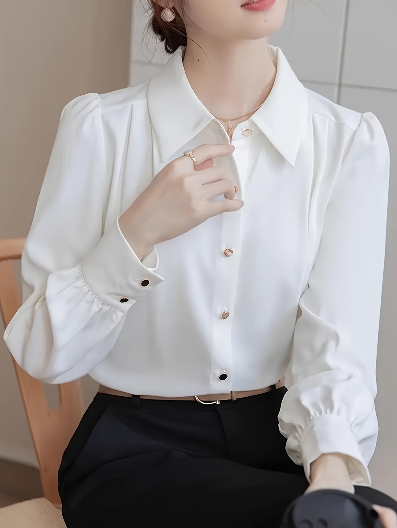 Plus Size, Women's Elegant Plus Size Long Sleeve Shirt - Classic Collar Button-Up Blouse with Golden Buttons, Solid Color Non-See-Through Fabric, Machine Washable All-Season Versatile Top for Casual & Professional Wear, Office Attire, Turndown Collar, Easy Care Material, Work Attire, Timeless Design, Durable Fabric, Fashionconscious Women