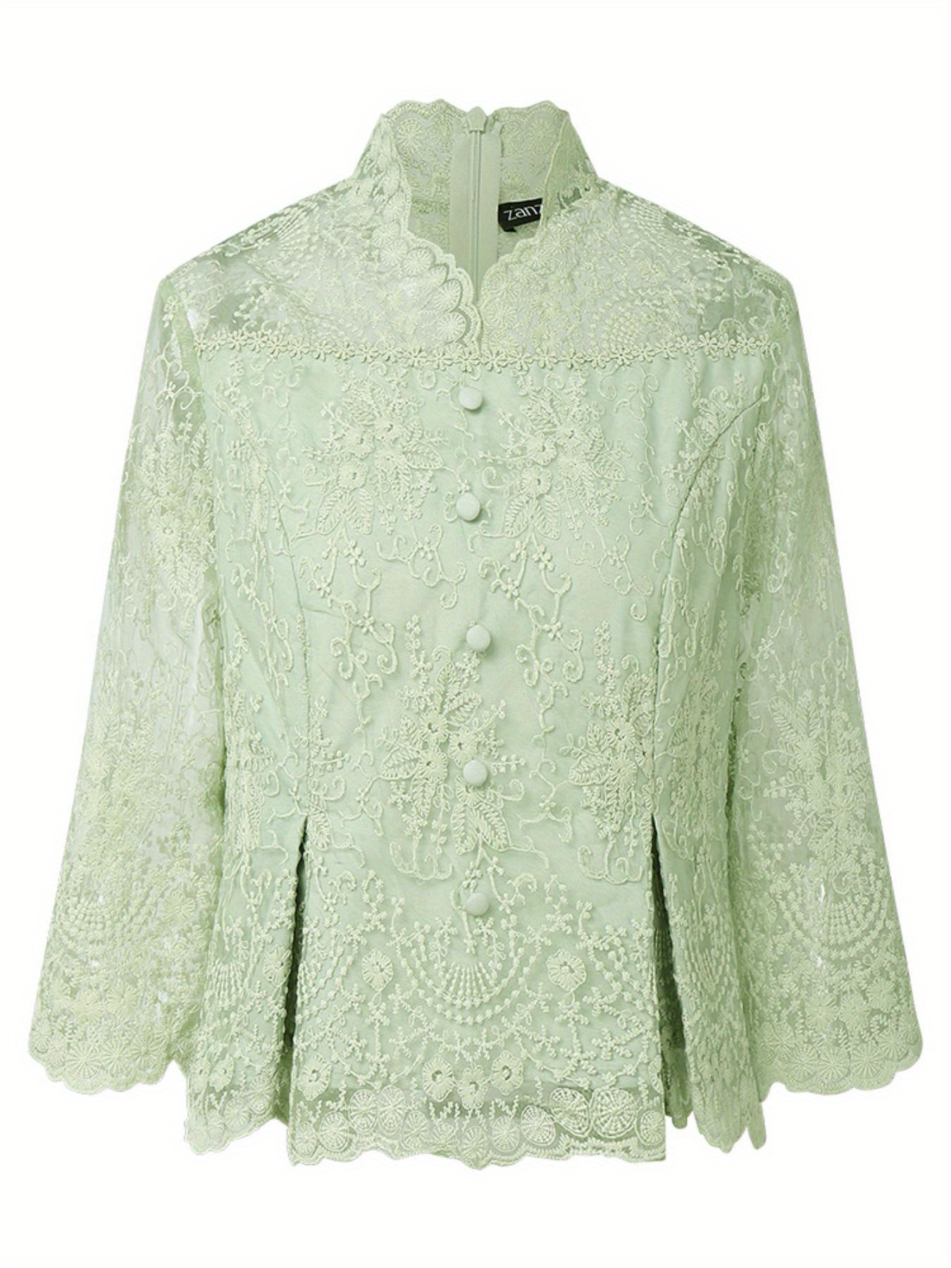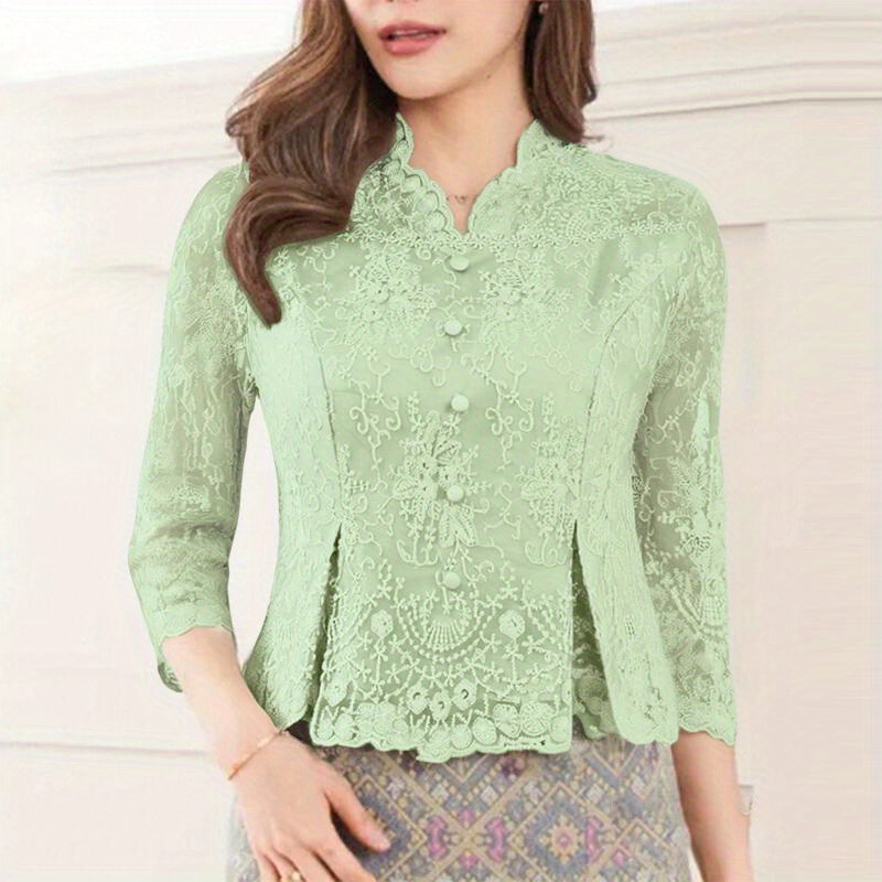 [Wedding & Party] Plus Size, ZANZEA Women's Plus Size Elegant Lace Patchwork Blouse - 3/4 Sleeve Wedding & Party Shirt with Front Button Closure, /Korean Inspired A-Line Lightweight Top, Machine Washable Golden Lace Jacket-like Blouse for Year-Round