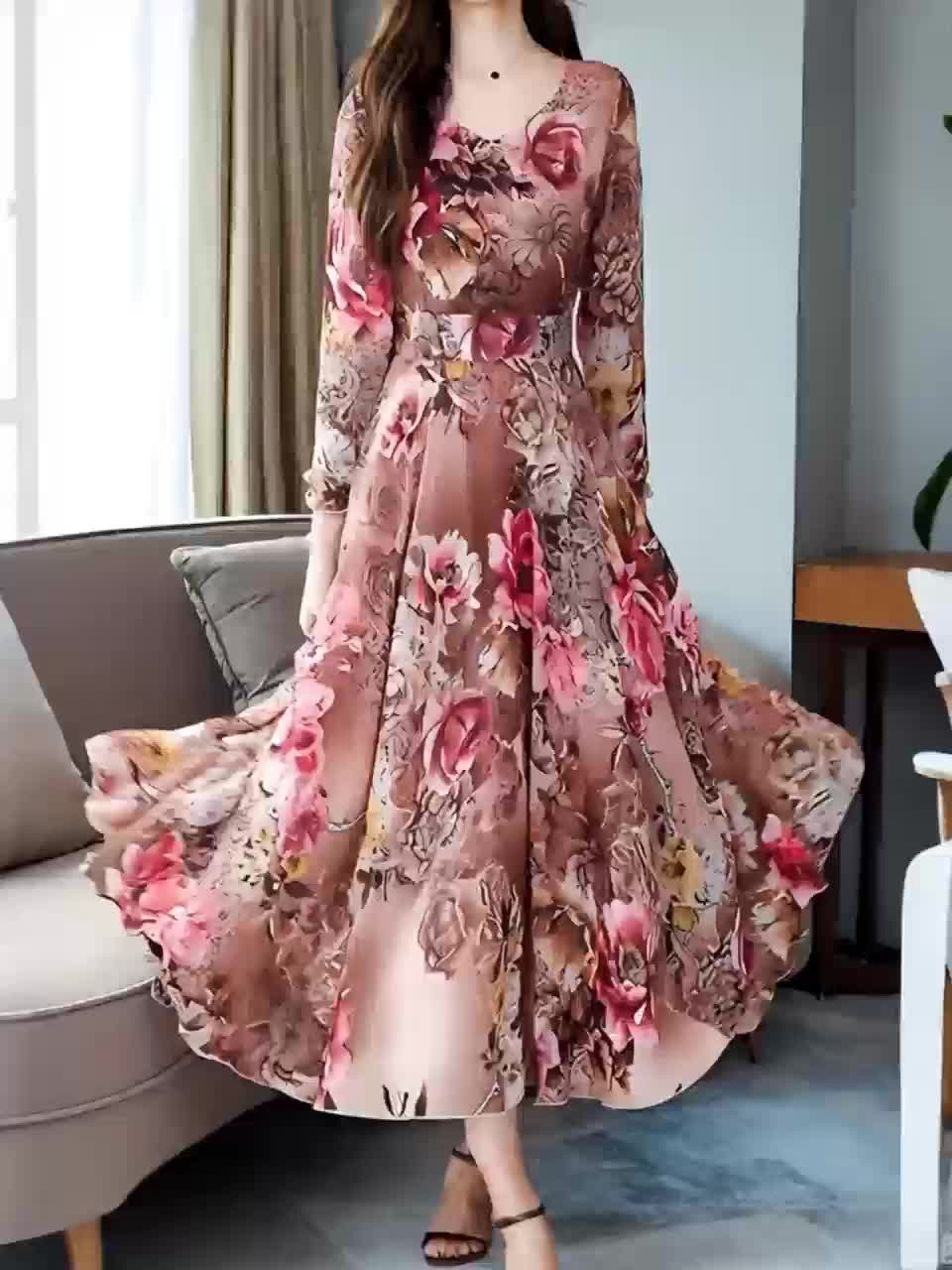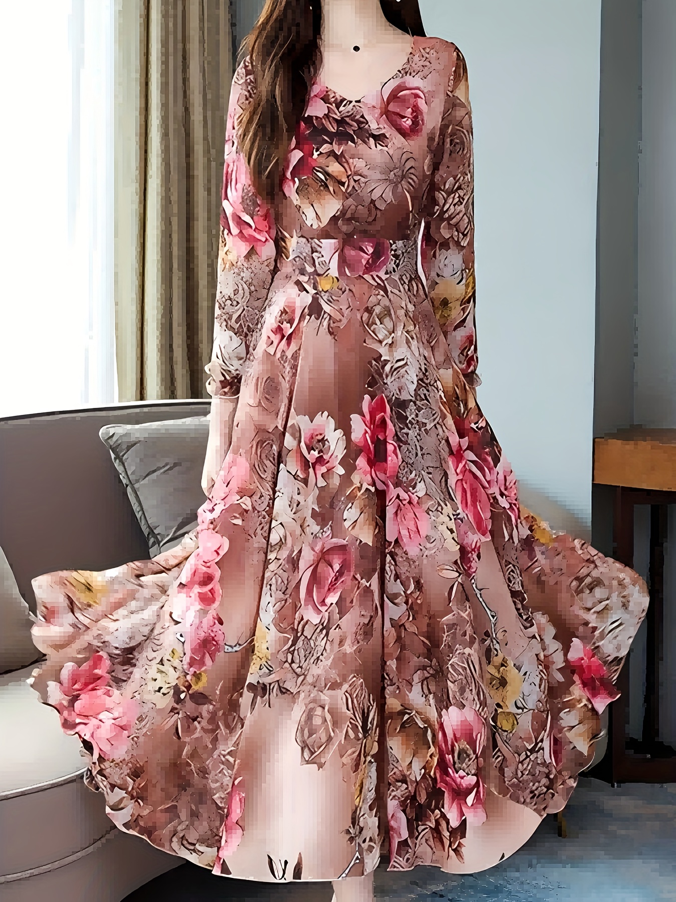 Elegant Women's V-Neck Floral Print Dress with Fitted Bodice & Flowy Skirt - Machine Washable, All-Season Versatile for Casual to Formal Occasions, No Stretch Fabric, Zipper Closure