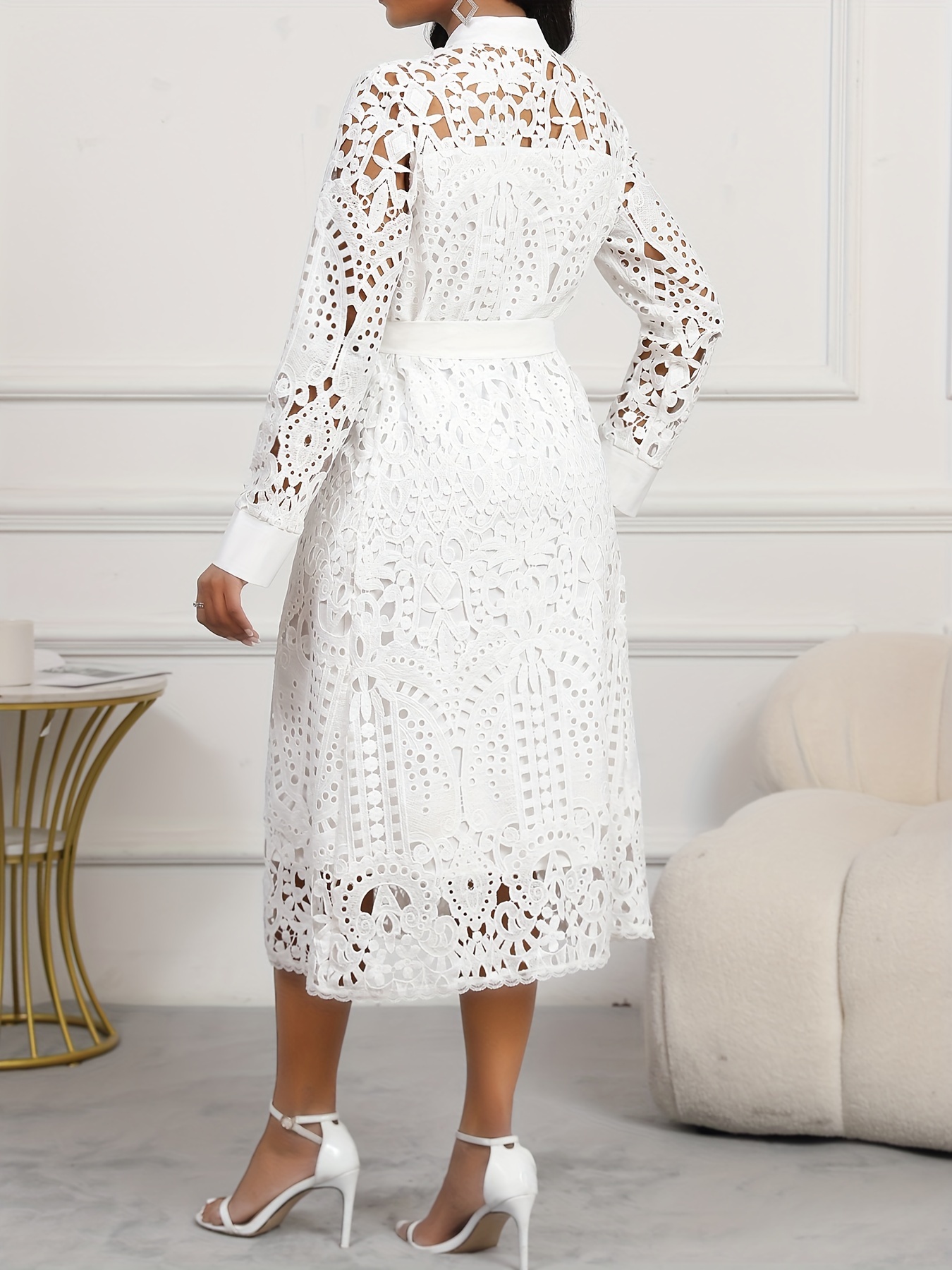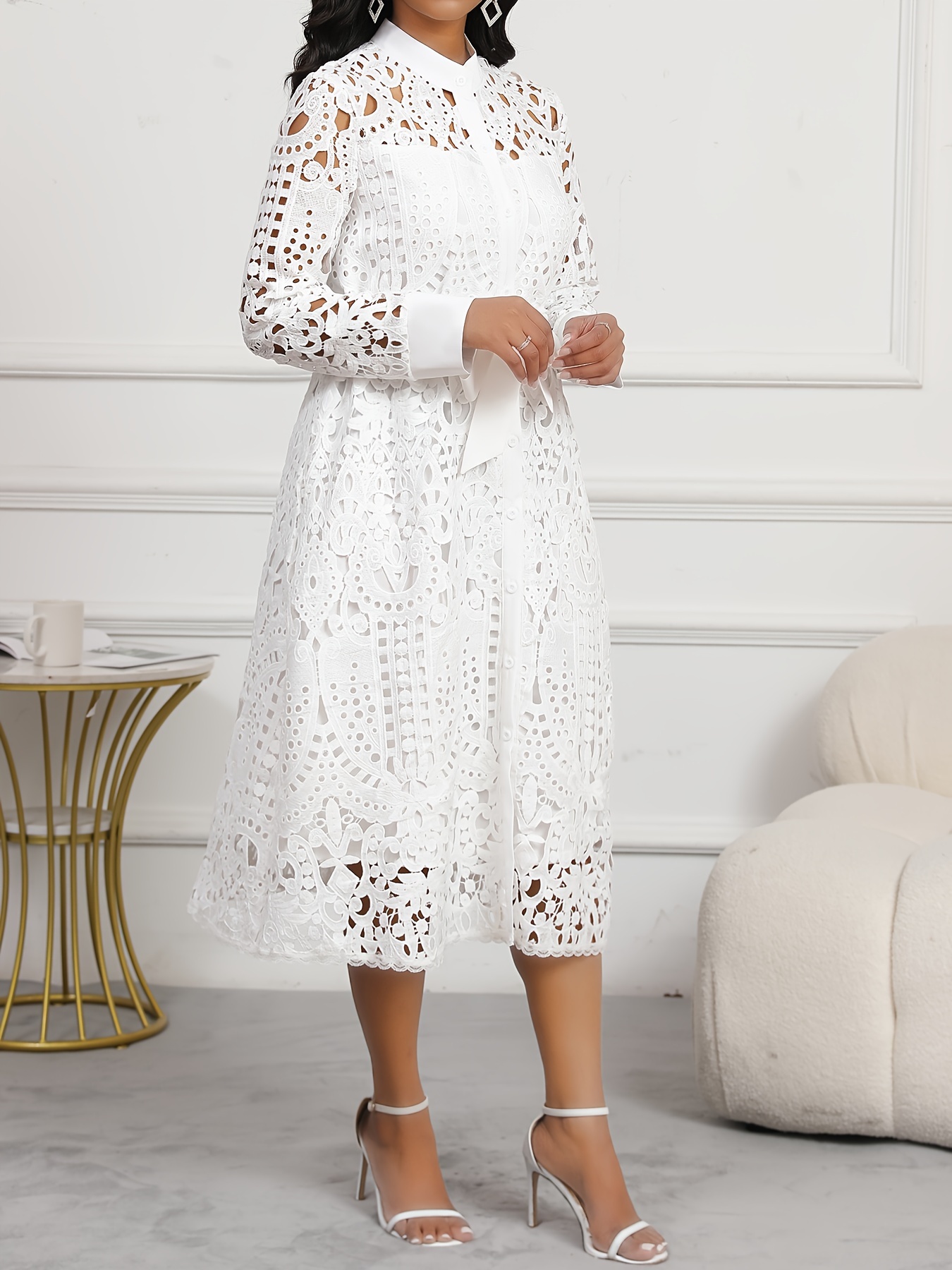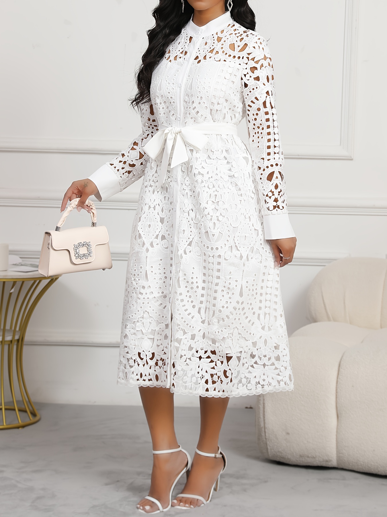 Spring/Autumn Women's Dress, Elegant Cut-Out Waist, Wedding/Date, Stand Collar White Lace Midi Dress WJ252