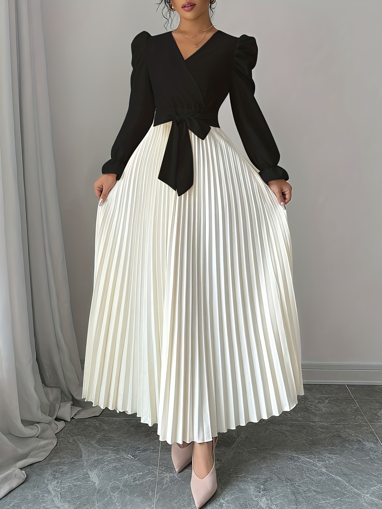 Women's Elegant V-Neck Long Sleeve A-Line Dress with Waist Tie Belt - Pleated Skirt, Machine Washable Solid Color, Spring/Summer Versatile Casual to Formal Wear, Spring Event Attire, Nontransparent Fabric, No Stretch Material