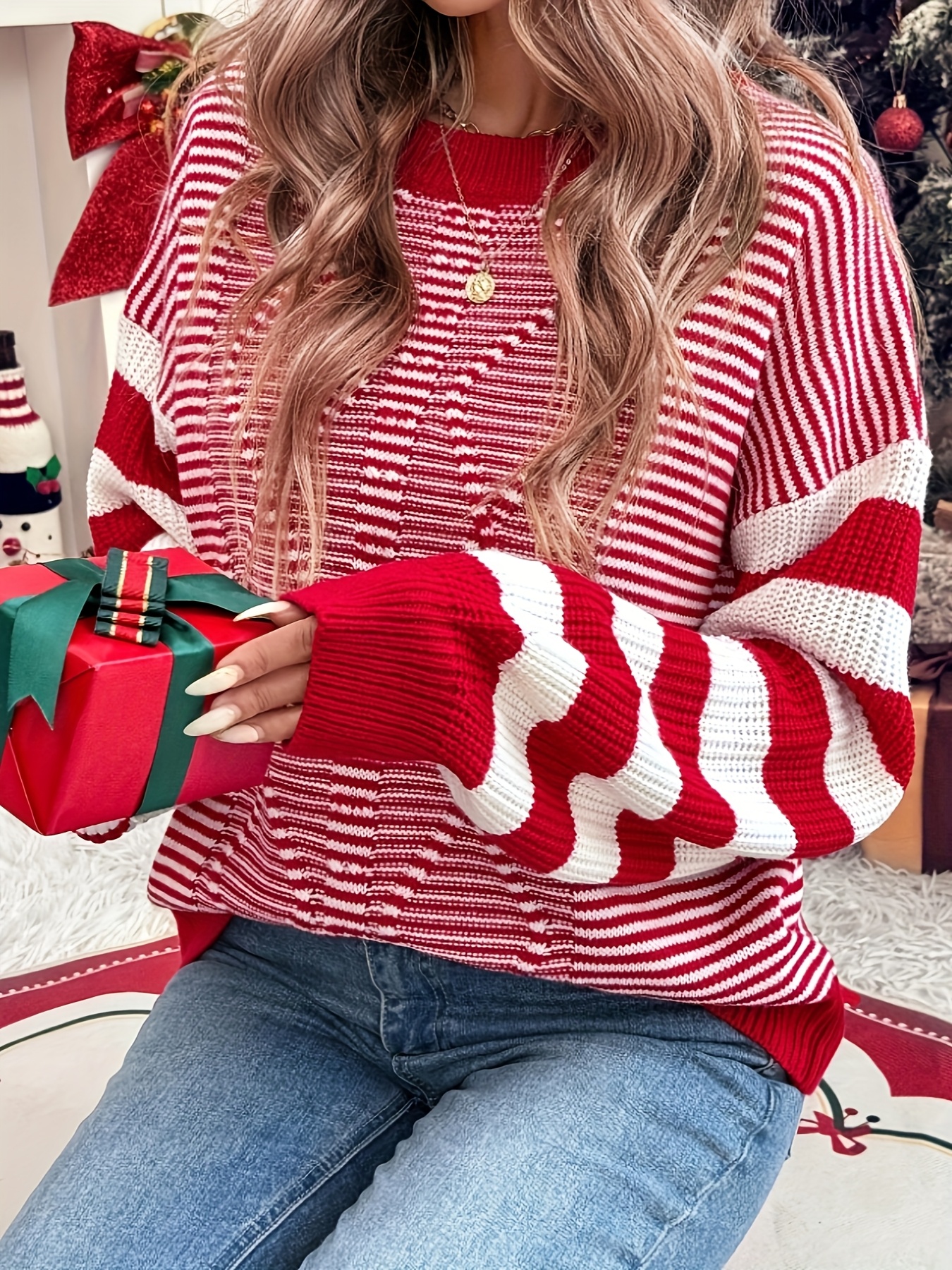 Women'S Red & White Striped Sweater - Long Sleeve Round Neck Pullover, All-Season Casual Elegant Sweater for Everyday & Formal Outfits