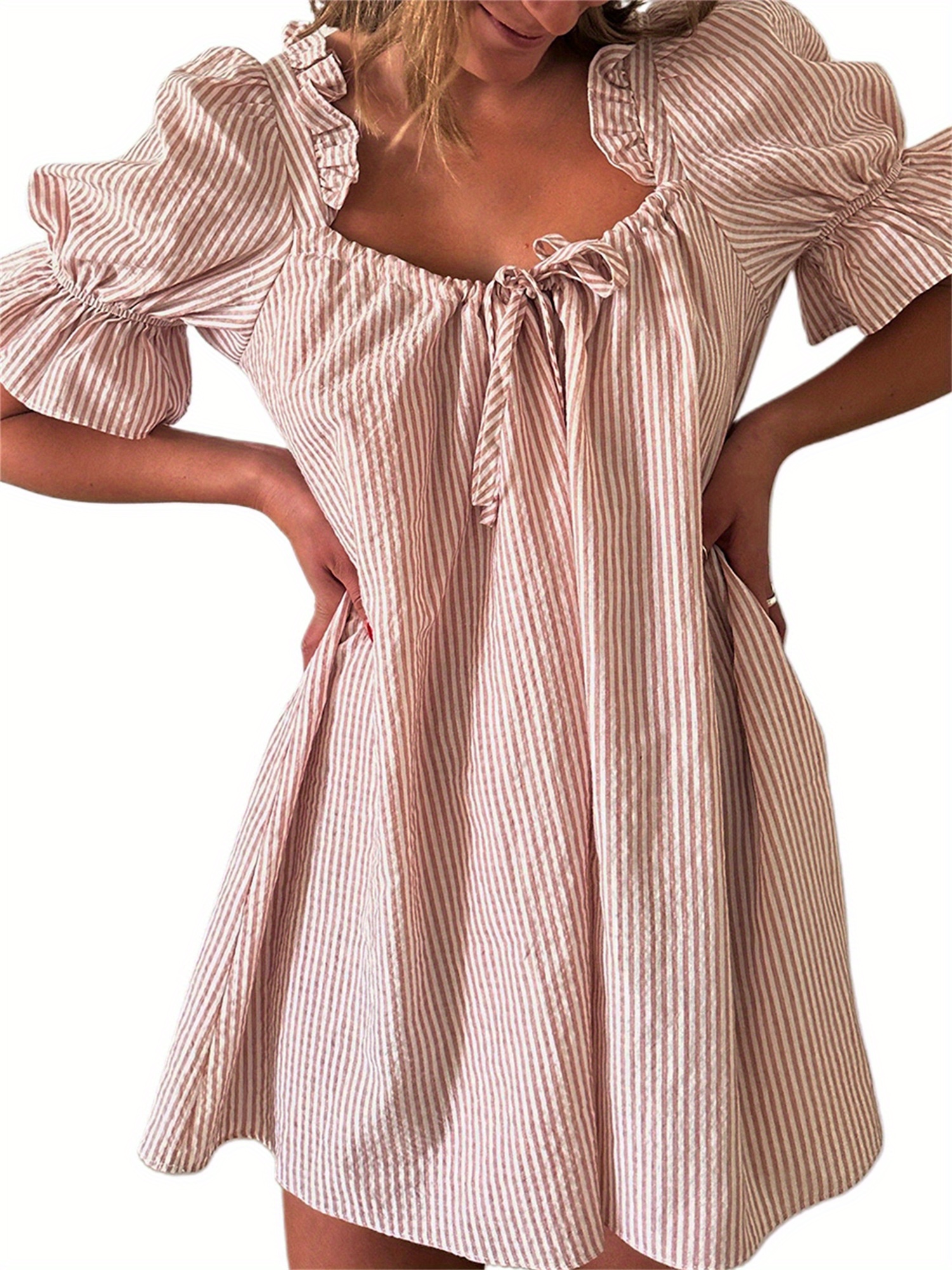 Womens Striped Babydoll Dress Loose Ruffle Trim Scoop Neck Puff Sleeve Backless Mini Dress for Daily Party Club