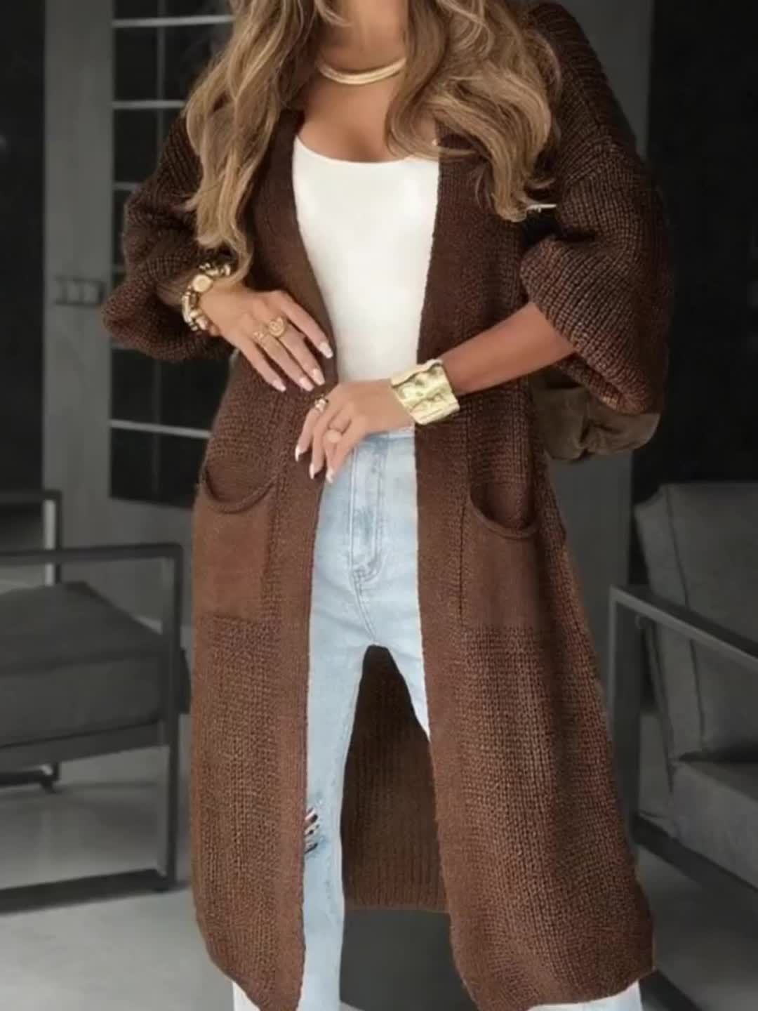 [Casual Wear Vneck Cardigan] Women's Casual V-Neck Ribbed Cardigan | Long Sleeve Button-Up with Pockets | Brown Fall/Winter Everyday Comfort