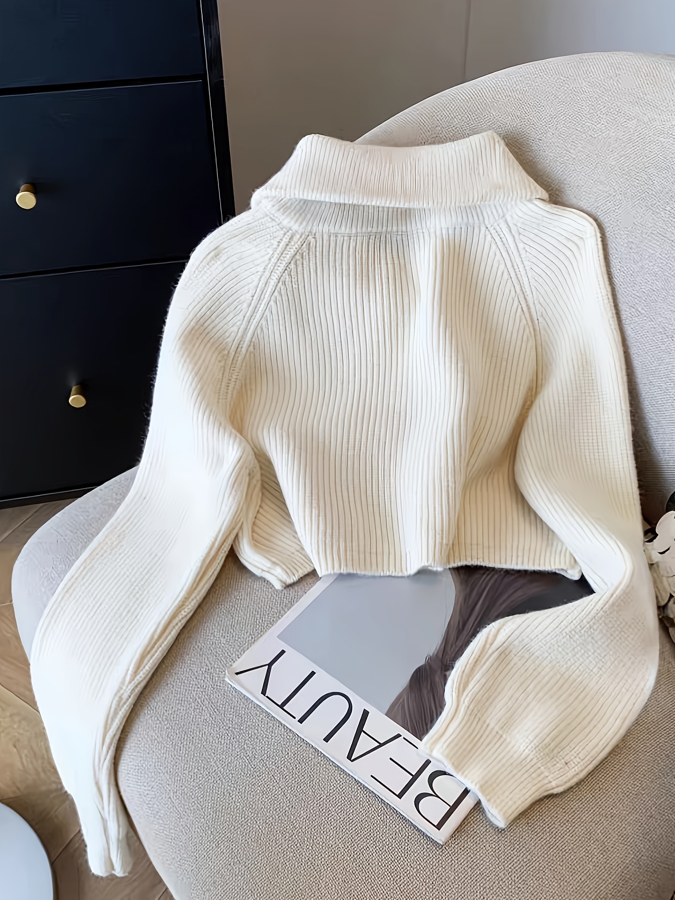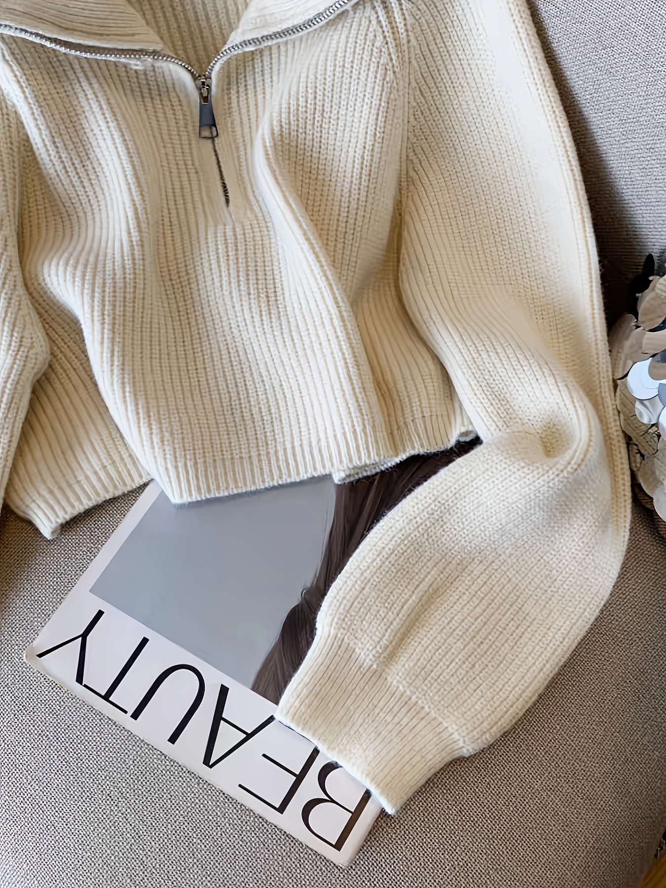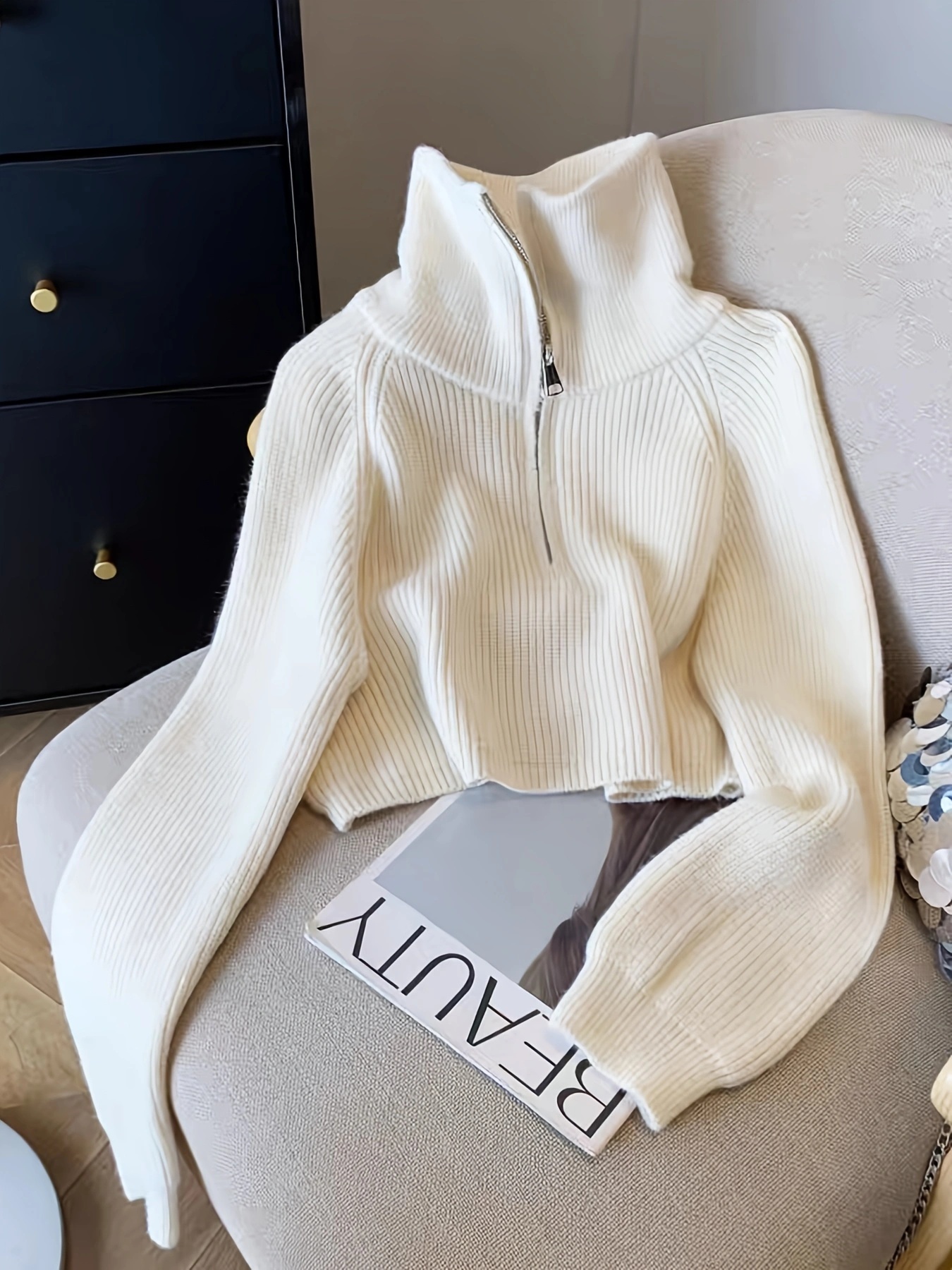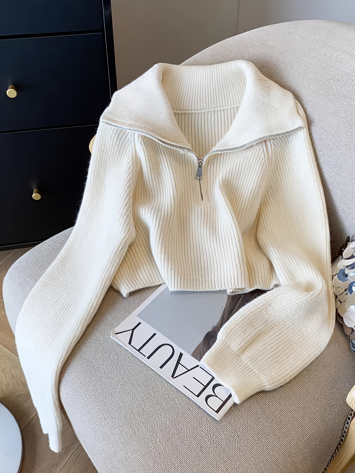 Women's Elegant Ribbed Zip-Up Sweater - Long Sleeve Stand Collar Short Length Slim Fit, Solid Color All-Season Versatile Layering Piece