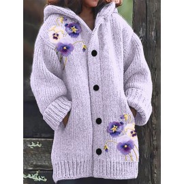 [Light Purple Hooded Sweater] European and American Retro Style Light Purple Hooded Thick Open Front Loose Long Sweater with Floral Print