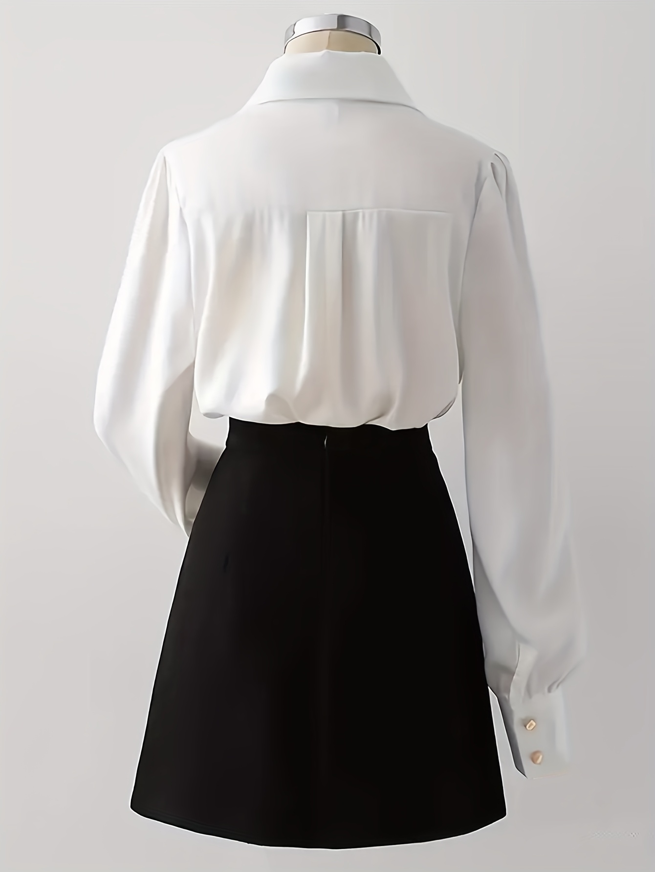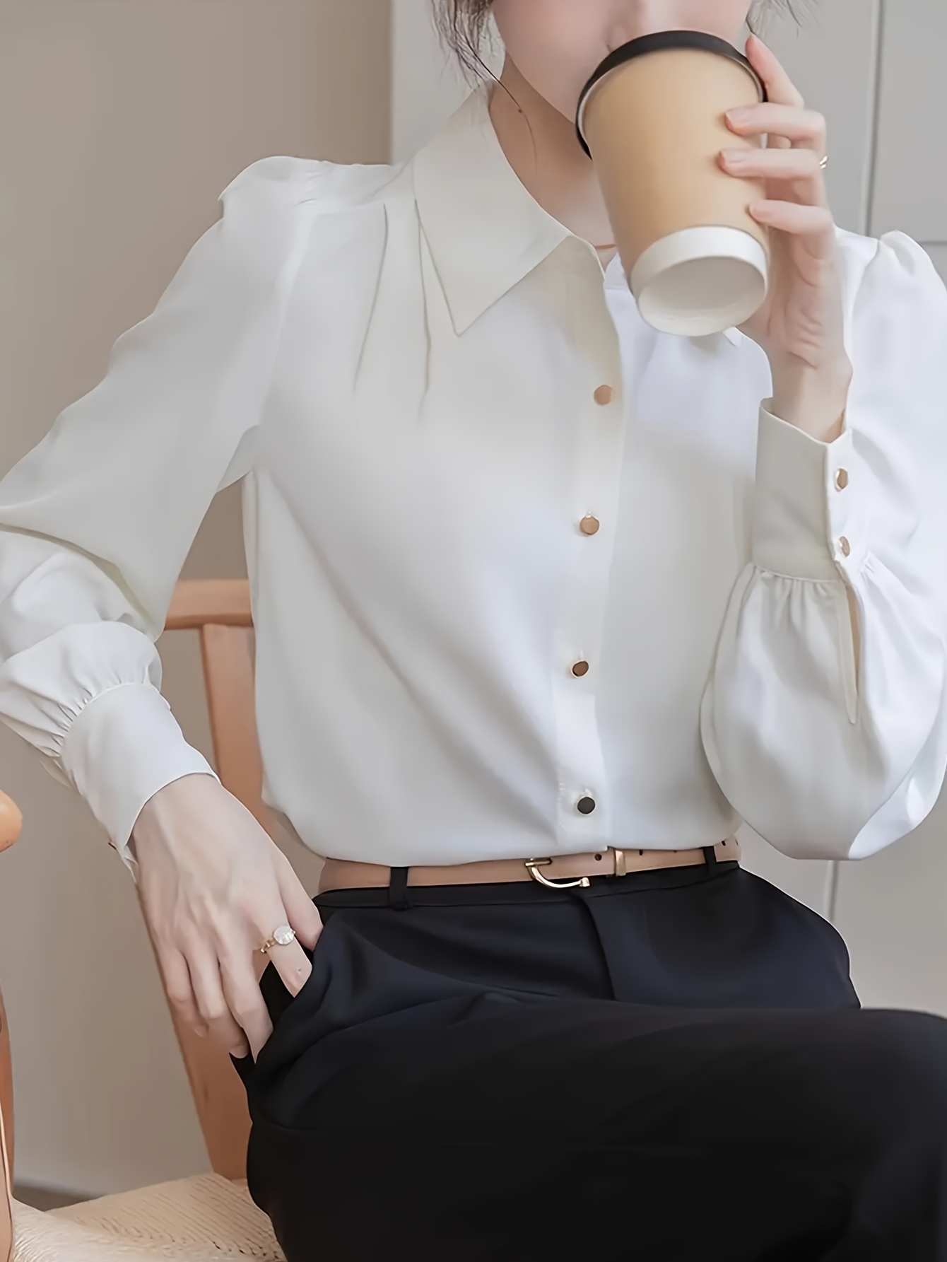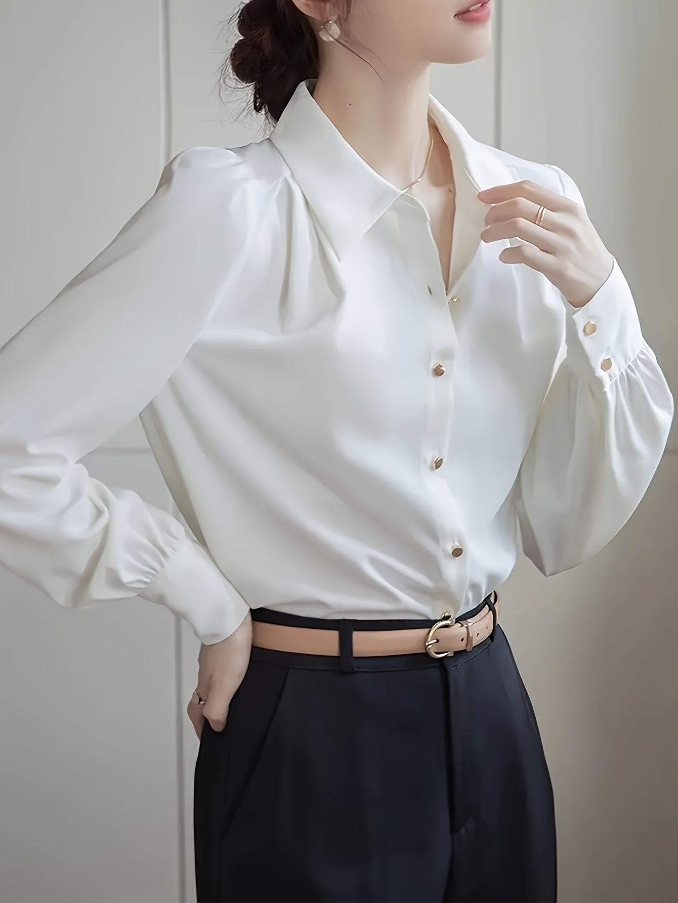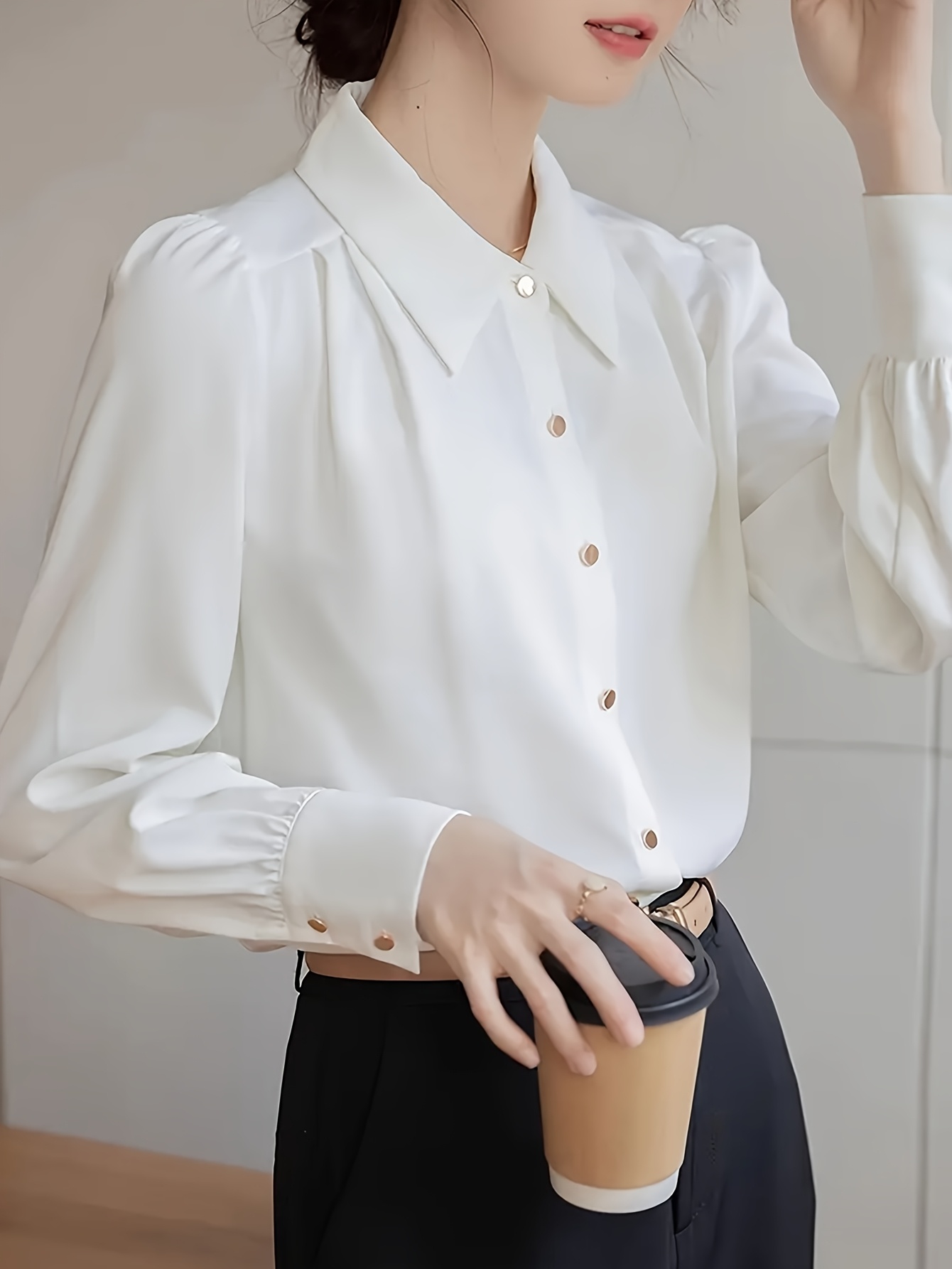 Plus Size, Women's Elegant Plus Size Long Sleeve Shirt - Classic Collar Button-Up Blouse with Golden Buttons, Solid Color Non-See-Through Fabric, Machine Washable All-Season Versatile Top for Casual & Professional Wear, Office Attire, Turndown Collar, Easy Care Material, Work Attire, Timeless Design, Durable Fabric, Fashionconscious Women