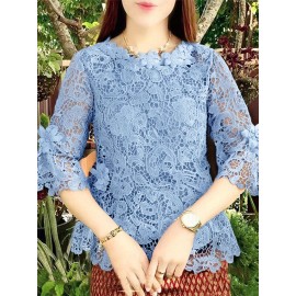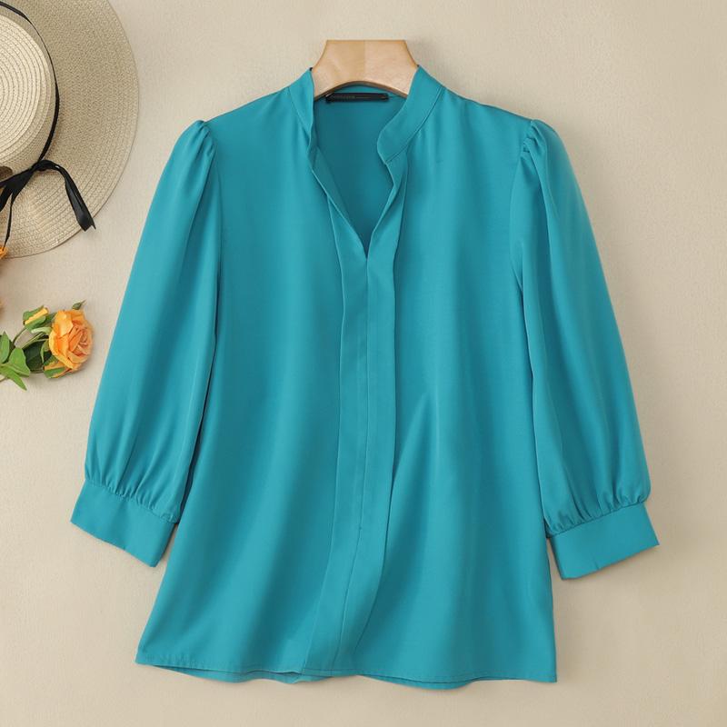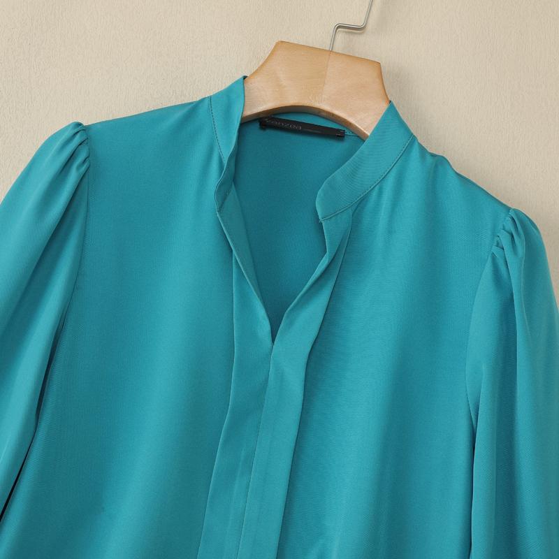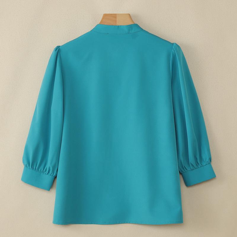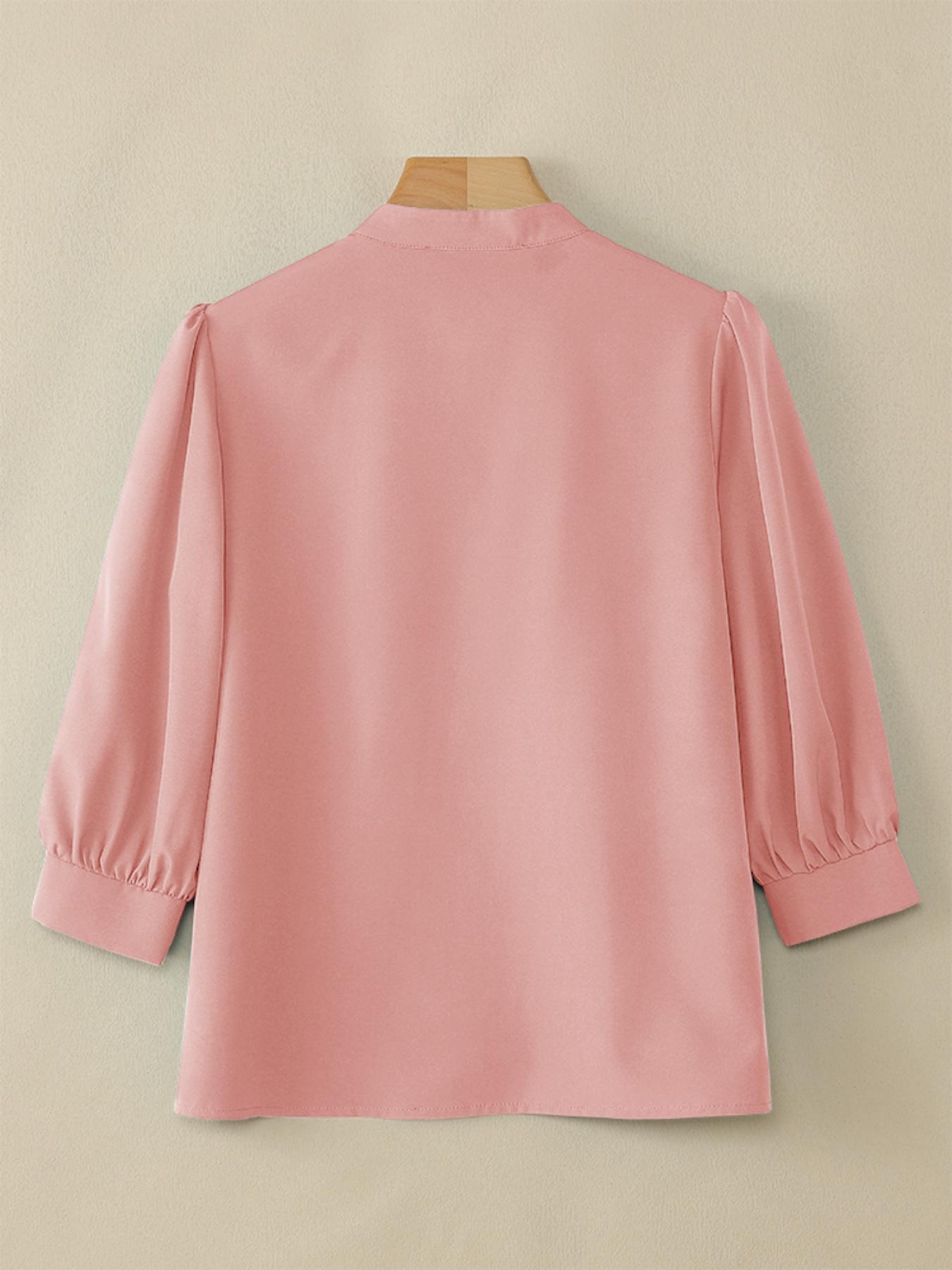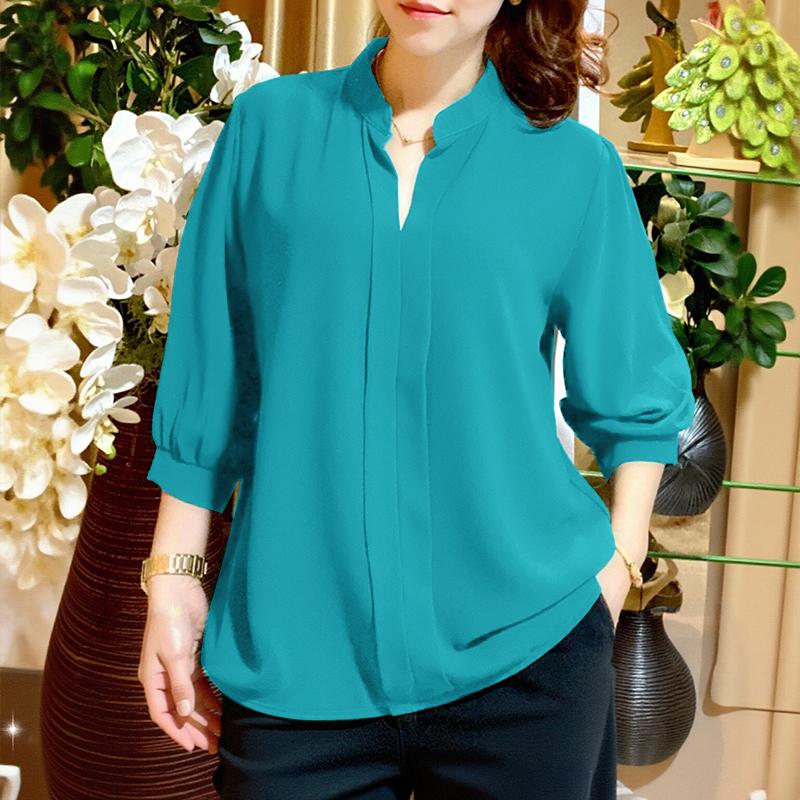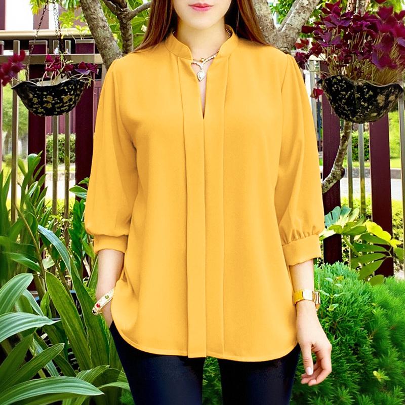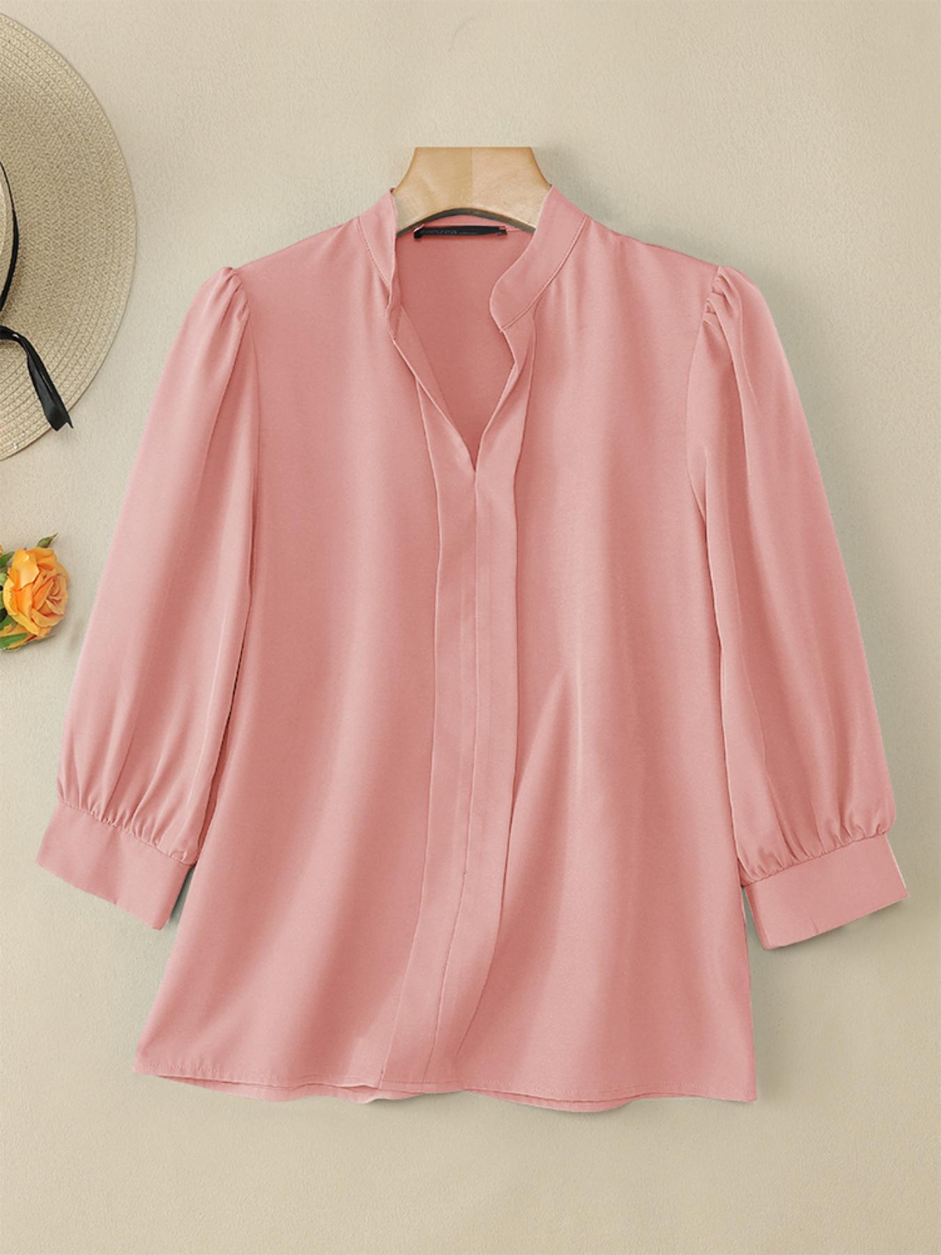 Plus Size - ZANZEA Women'S Elegant 3/4 Lantern Sleeve Stand Collar Blouse - Lightweight Non-Stretch Solid Color Casual Shirt with Button Front, All-match Leisure Top For Plus Size, Versatile Clothing
