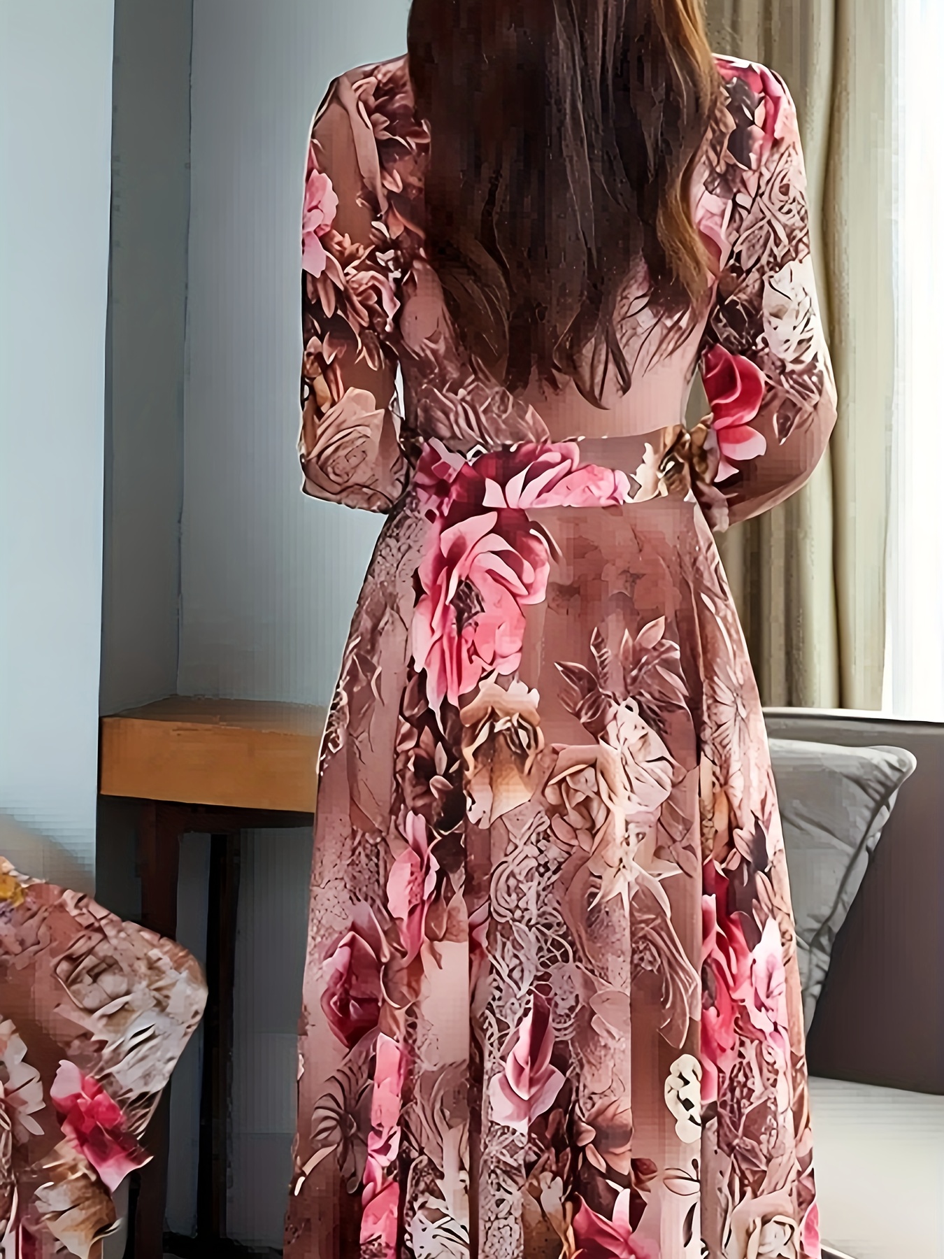 Elegant Women's V-Neck Floral Print Dress with Fitted Bodice & Flowy Skirt - Machine Washable, All-Season Versatile for Casual to Formal Occasions, No Stretch Fabric, Zipper Closure