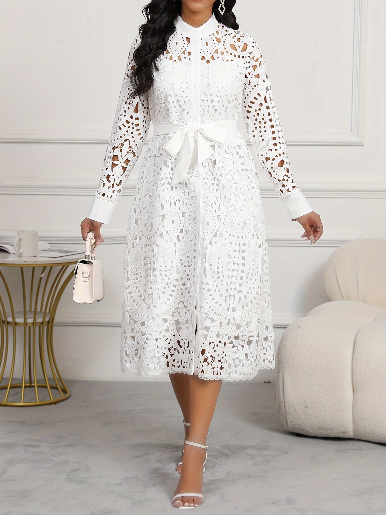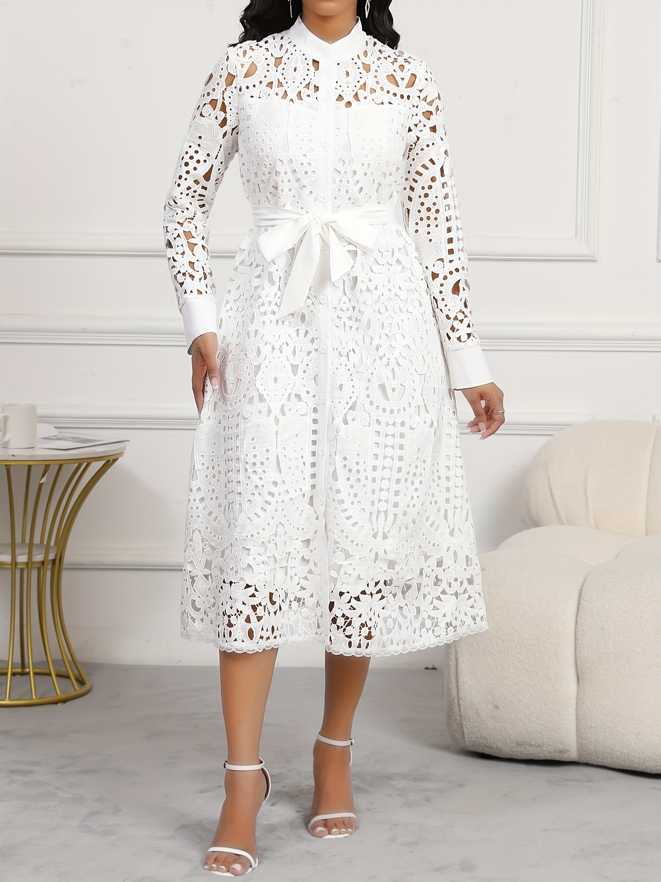 Spring/Autumn Women's Dress, Elegant Cut-Out Waist, Wedding/Date, Stand Collar White Lace Midi Dress WJ252