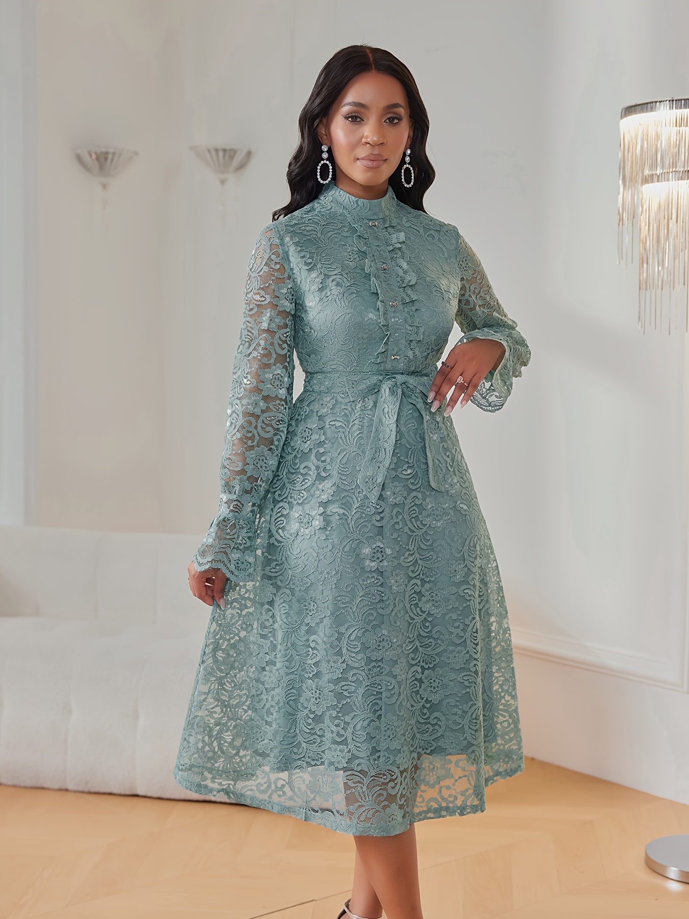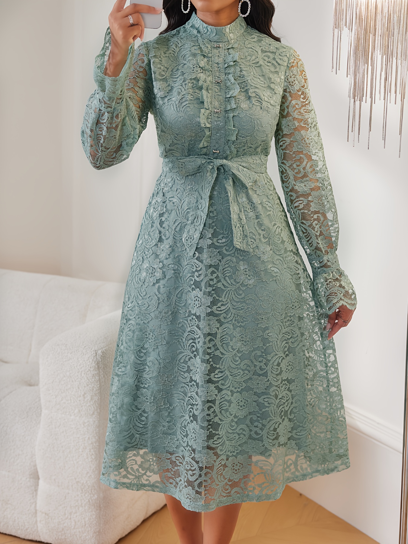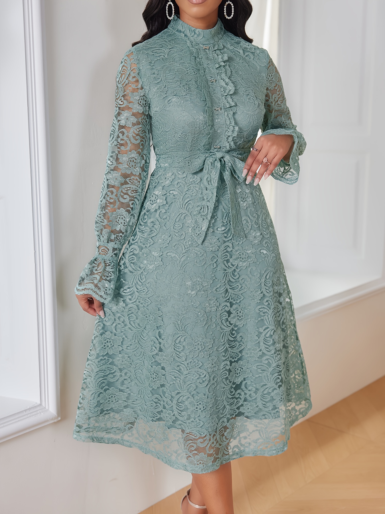 Women'S Elegant Mint Green Lace Dress with Belted Waist & Ruffled Hem - Long Sleeve A-Line Mid-Length Formal & Casual Dress for Weddings, Business