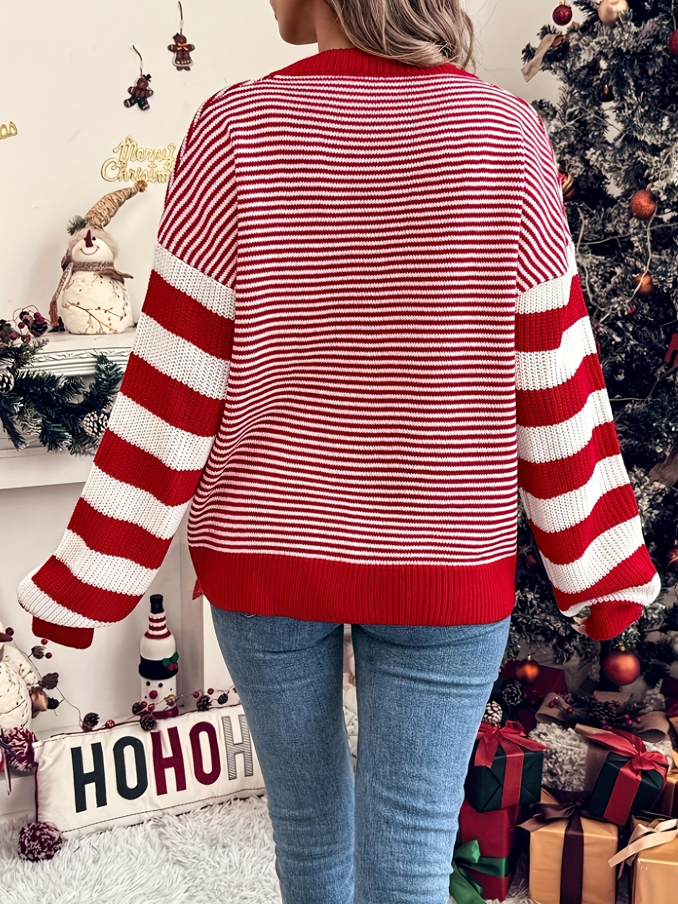 Women'S Red & White Striped Sweater - Long Sleeve Round Neck Pullover, All-Season Casual Elegant Sweater for Everyday & Formal Outfits