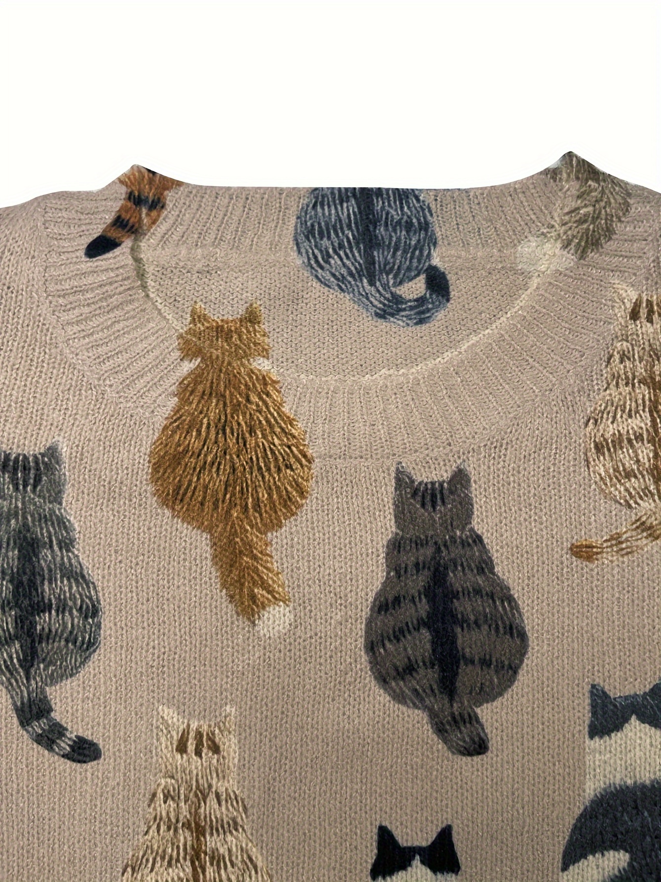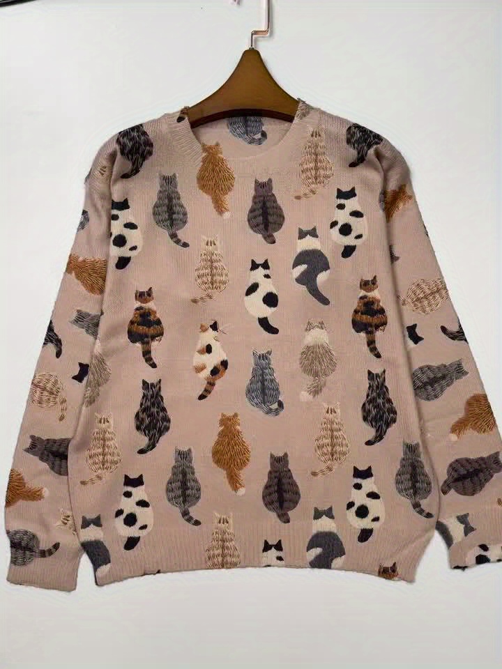 Women'S All-Over Cat Back Print Sweater - Soft & Brown Tabby Cat Design, Round Neck Long Sleeve Casual Sweater, Lightweight Everyday & Formal Outfits